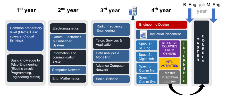 At its core, communications engineering studies electromagnetics; communication electronics; communication systems; information and signal processing; communication networks; services and applications. Furthermore, it is an interdisciplinary field that requires combination with artificial intelligence and working knowledge on management and regulations. In addition to that, it is also supported by general knowledge such as ethics, civics, environmental sciences, communications, data science, engineering design, and entrepreneurship.